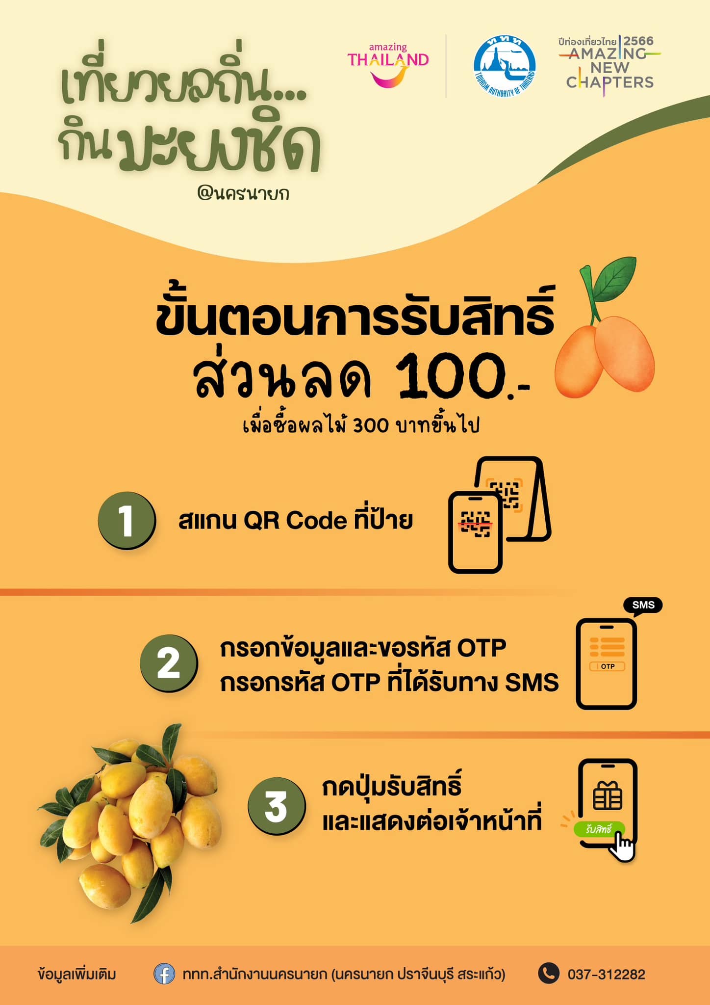 ททท. ร่วมกับ สมาคมชาวสวนมะปราง จ.นครนายก โดย ททท. สำนักงานนครนายก ชวนเที่ยวงาน “เที่ยวยลถิ่น กินมะยงชิด” พร้อมอิ่มฟินกินมะยงชิด โดยแจกโปรโมชั่นส่วนลดมูลค่า 100 บาท จาก 13 สวนผลไม้ที่เข้าร่วม เมื่อซื้อผลไม้ 300 บาทขึ้นไป โดยคุณสามารถติดต่อทางสวนที่ร่วมโครงการได้โดยตรง ตามรายชื่อด้านล่าง (1 ท่าน / 1 สิทธิ์ / 1 สวน / วัน) ส่วนลดนี้ สามารถใช้ได้ตั้งแต่วันที่ 1 มีนาคม - 30 เมษายน นี้ หรือจนกว่าสิทธิ์จะหมด