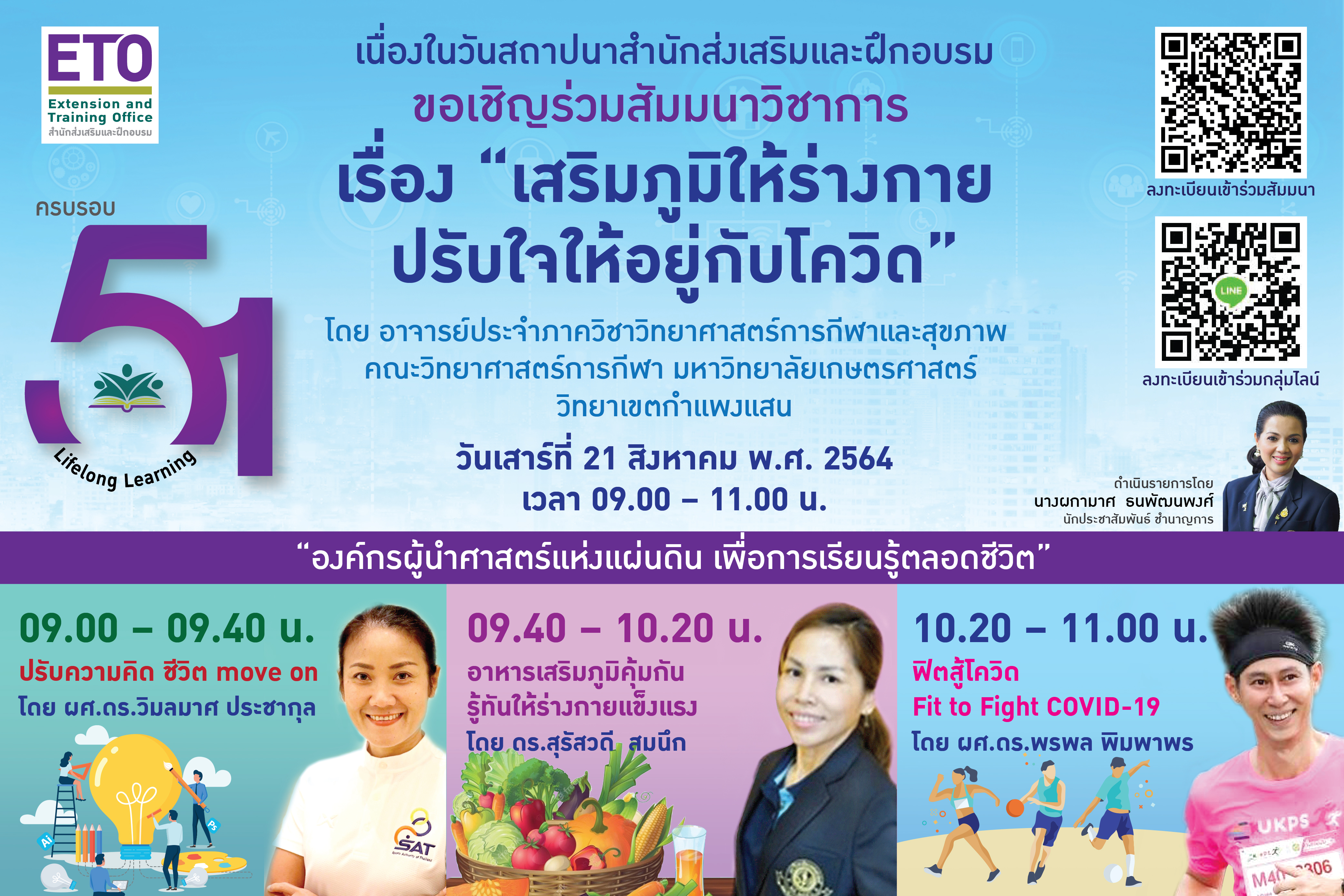 รศ.สุวิสา พัฒนเกียรติ ผอ.สำนักส่งเสริมและฝึกอบรม กล่าวว่า เพื่อถ่ายทอดความรู้ และแลกเปลี่ยนประสบการณ์ที่เป็นประโยชน์ในการดูแลร่างกาย และปรับพฤติกรรมการใช้ชีวิตประจำวันเพื่อเสริมภูมิคุ้มกันให้ตนเองห่างไกลจากโควิด-19มหาวิทยาลัยเกษตรศาสตร์ โดยสำนักส่งเสริมและฝึกอบรม ขอเชิญชวนผู้สนใจสร้างภูมิคุ้มกันให้ร่างกาย ร่วมกิจกรรมสัมมนาทางวิชาการออนไลน์ผ่าน โปรแกรม zoom เนื่องในโอกาสวันคล้ายวันสถาปนา 51 ปี เรื่อง “เสริมภูมิให้ร่างกาย ปรับใจให้อยู่กับโควิด” รับความรู้พร้อมพูดคุยแลกเปลี่ยนประสบการณ์ กับ วิทยากรจากภาควิชาวิทยาศาสตร์การกีฬาและสุขภาพ คณะภาควิชาวิทยาศาสตร์การกีฬา มหาวิทยาลัยเกษตรศาสตร์ วิทยาเขตกำแพงแสน ได้แก่ ผศ.ดร.วิมลมาศ ประชากุล ในหัวข้อ ปรับความคิด ชีวิต move on ดร.สุรัสวดี สมนึก ในหัวข้อ อาหารเสริมภูมิคุ้มกัน รู้ทันให้ร่างกายแข็งแรง และ ผศ.ดร.พรพล พิมพาพร ในหัวข้อ ฟิตสู้โควิด Fit to Fight COVID-19 ดำเนินรายการโดย คุณผกามาศ ธนพัฒนพงศ์ นักประชาสัมพันธ์ ชำนาญการ ในวันเสาร์ที่ 21 สิงหาคม 2564 เวลา 09.00 – 11.00 น. โดยไม่มีค่าใช้จ่าย (ฟรี) ผ่านทาง zoom ลงทะเบียนสำรองชื่อ หรือสมัครด้วยตนเองที่หน้าเว็ปไชด์ www.eto.ku.ac.th และเพจเฟซบุ๊คสำนักส่งเสริมและฝึกอบรม มหาวิทยาลัยเกษตรศาสตร์ สอบถามรายละเอียดเพิ่มเติม Inbox เพจเฟซบุ๊ค หรือ โทร 0 29428820-9 ต่อ 400 - 405