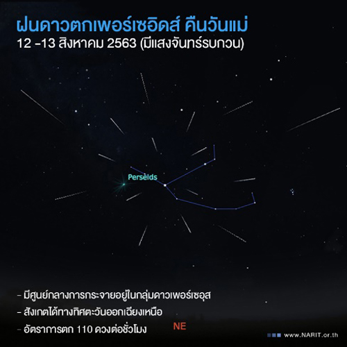 ฝนดาวตก กลุ่มนี้เกิดจากเศษฝุ่นละอองของดาวหางสวิฟท์-ทัตเทิล เหลือทิ้งไว้ในวงโคจร เมื่อโลกโคจรตัดผ่านเข้ามาในชั้นบรรยากาศ เกิดการลุกไหม้เป็นแสงสว่างบนท้องฟ้า สามารถชมปรากฎการณ์นี้ได้ทุกพื้นที่