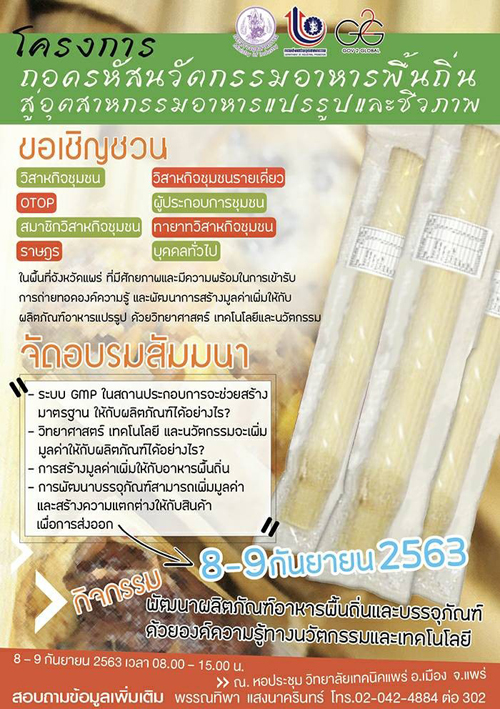 โครงการถอดรหัสนวัตกรรมอาหารพื้นถิ่นสู่อุตสาหกรรมอาหารแปรรูปและชีวภาพ ได้มีการจัดอบรมสัมนาในวันที่ 8 - 9 กันยายน 2563 ที่ผ่านมา ณ ที่ห้องประชุม วิทยาลัยเทคนิคแพร่ โดยมีนายวรวัจน์ เอื้ออภิญญกุล อดีตรัฐมนตรีว่าการกระทรวงศึกษาธิการ เป็นประธานในการอบรมสัมมนา ในหัวข้อ “การสร้างมูลค่าเพิ่มให้กับผลิตภัณฑ์อาหารแปรรูปโดยการใช้วิทยาศาสตร์ เทคโนโลยีและนวัตกรรม” ภายใต้โครงการถอดรหัสนวัตกรรมอาหารพื้นถิ่นสู่อุตสาหกรรมอาหารแปรรูปและชีวภาพ ร่วมด้วย นางสาวนิรามัย ศิริสุดากุล ผู้อำนวยการศูนย์ส่งเสริมอุตสาหกรรมภาคที่ 1 โดยมีวิทยากรผู้ทรงคุณวุฒิในด้านต่างๆมาร่วมถ่ายทอดองค์ความรู้ อาทิ ผศ.มานะ เอี่ยมบัว จาก มหาวิทยาลัยสวนดุสิต วิทยาเขตสุพรรณบุรี ผศ.ดร. สุเชษฐ์ สมุหเสนีโต จากมหาวิทยาลัยศิลปากร วิทยาเขตพระราชวังสนามจันทร์ ผศ.ดร. นฤมล นันทรักษ์ อาจารย์โรงเรียนการเรือน มหาวิทยาลัยสวนดุสิต คุณปาลิดา สุขพันธ์ ผู้เชี่ยวชาญ ด้านโรงงานผลิตอาหาร และบริษัท กอฟ ทู โกลบอล จำกัด ร่วมเป็นวิทยากรในการให้ความรู้ และสร้างความเข้าใจให้กับผู้ประกอบการเพื่อการพัฒนาร่วมกัน โดย มีผู้ประกอบการในจังหวัดแพร่นำผลิตภัณฑ์ของตนเข้าร่วมในการคัดเลือกเพื่อเข้าสู่ระบบการพัฒนาต่อไป ในโครงการนี้มีการคัดเลือกผลิตภัณฑ์จากคณะกรรมการผู้ทรงคุณวุฒิจำนวน 5 รายการ คือ น้ำพริกน้ำย้อยจากร้านอาหวัง ขนมเส้นน้ำใสจากร้านขนมเส้นดวงเนตร(เก๋ากึ๊ก) ข้าวหลามจากร้านป้าภา แกงฮังเลจากสูตรคุณพัชรี เวียงนอก และจิ้นนึ่งจากสูตรคุณศิริพร ศิริรัตน์ ซึ่งทั้ง 5 รายการได้เข้ารับการพัฒนาผลิตภัณฑ์และบรรจุภัณฑ์ โดยใช้เทคโนโลยีและนวัตกรรมที่ทันสมัยเพื่อตอบโจทย์ความต้องการของตลาด สามารถยืดอายุการเก็บรักษา และคงคุณภาพของอาหารได้อย่างสมบูรณ์ จากการอบรมในจังหวัดแพร่ครั้งนี้ ได้รับการตอบรับและประสบความสำเร็จเป็นอย่างดี ในวันที่ 21 กันยายน 2563 ที่ผ่านมาได้มีการจัดพิธีปิดโครงการถอดรหัสนวัตกรรมอาหารพื้นถิ่นสู่อุตสาหกรรมอาหารแปรรูปและชีวภาพไปเป็นที่เรียบร้อย
