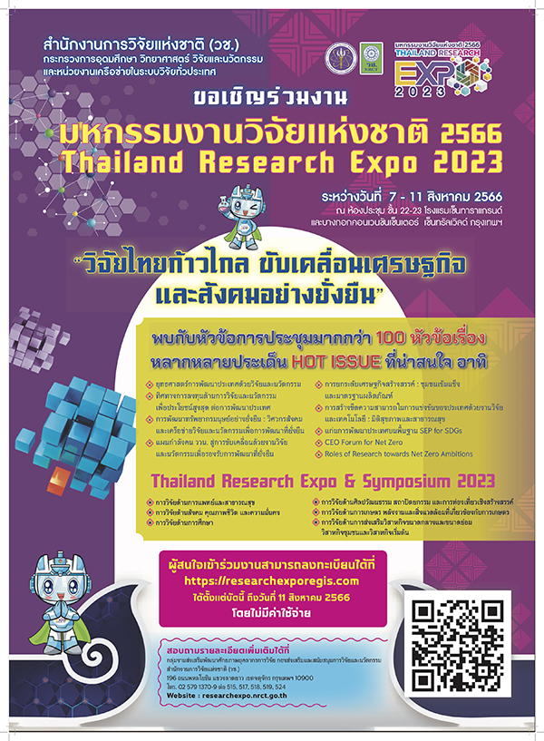 วช. ขอเชิญชวนนิสิต นักศึกษา และประชาชนทั่วไป เข้าชมงาน “มหกรรมงานวิจัยแห่งชาติ 2566หรือ Thailand Research Expo2023 ที่จะจัดขึ้นระหว่างวันที่ 7-11 สิงหาคม 2566 เวลา 09.00 – 17.00 น. ณ ห้องประชุมชั้น 22-23 โรงแรมเซ็นทาราแกรนด์ และบางกอกคอนเวนชั่นเซ็นเตอร์ เซ็นทรัลเวิลด์ กรุงเทพ ผู้สนใจศึกษารายละเอียดเพิ่มเติมได้ที่ www.researchexpo.go.th
