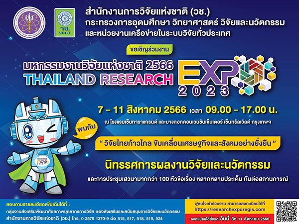 สำนักงานการวิจัยแห่งชาติ (วช.) กระทรวงการอุดมศึกษา วิทยาศาสตร์ วิจัยและนวัตกรรม ขอชวนชิม ซ็อป เพลิน เดินตลาดงานวิจัย โดยฝีมือคนไทย ในงาน “มหกรรมงานวิจัยแห่งชาติ 2566 (Thailand Research Expo 2023)” ซึ่งจะจัดขึ้นระหว่างวันที่ 7-11 สิงหาคม 2566 ณ ชั้น 22-23 โรงแรมเซ็นทาราแกรนด์ และบางกอกคอนเวนชันเซ็นเตอร์ ซึ่ง วช. นำผลงานวิจัยที่ได้รับการสนับสนุนจาก วช. และผลงานวิจัยในระบบเครือข่ายวิจัย ซึ่งต่อยอดเป็นผลิตภัณฑ์ที่พร้อมใช้มานำเสนอเพื่อเป็นทางเลือกให้กับนักช็อป หนึ่งในผลงานกว่า 1,000 ผลงาน จากเครือข่ายในระบบวิจัยมากกว่า 170 หน่วยงาน ได้แก่ผลงานวิจัย “ผลิตภัณฑ์ขนมขบเคี้ยวปลาแผ่นกรอบ” และ “ผลิตภัณฑ์กุ้งกรอบเม็ดมะม่วงหิมพานต์รสต้มยำ” ของ ผศ.ดร.สุชาดา