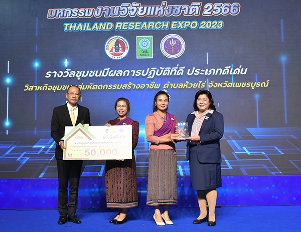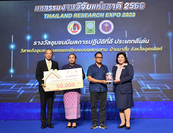 วันที่ 7 สิงหาคม 2566 สำนักงานการวิจัยแห่งชาติ (วช.) กระทรวงการอุดมศึกษา วิทยาศาสตร์ วิจัยและนวัตกรรม ร่วมกับ กองอำนวยการรักษาความมั่นคงภายในราชอาณาจักร (กอ.รมน.) จัดพิธีมอบรางวัล “ชุมชนต้นแบบเพื่อการพัฒนาอย่างยั่งยืนด้วยผลงานวิจัยและนวัตกรรม” ซึ่งเป็นการขยายผลความสำเร็จของการพัฒนาพื้นที่ชุมชนสังคมด้วยวิจัยและนวัตกรรม ภายใต้บันทึกข้อตกลงความร่วมมือการใช้ประโยชน์องค์ความรู้จากผลงานวิจัยและนวัตกรรมเพื่อการพัฒนาเชิงพื้นที่ : ชุมชนเข้มแข็งด้วยวิจัยและนวัตกรรม ระหว่าง วช. และ กอ.รมน. โดยมี ดร.วิภารัตน์ ดีอ่อง ผู้อำนวยการสำนักงานการวิจัยแห่งชาติ และ พลโท วิกร เลิศวัชรา รองเลขาธิการกองอำนวยการรักษาความมั่นคงภายในราชอาณาจักร เป็นประธานมอบรางวัลฯ ณ เวที Highlight Stage ในงาน “มหกรรมงานวิจัยแห่งชาติ 2566 : Thailand Research Expo 2023” ชั้น 22 โรงแรมเซ็นทาราแกรนด์ และบางกอกคอนเวนชันเซ็นเตอร์ เซ็นทรัลเวิลด์ กรุงเทพมหานคร