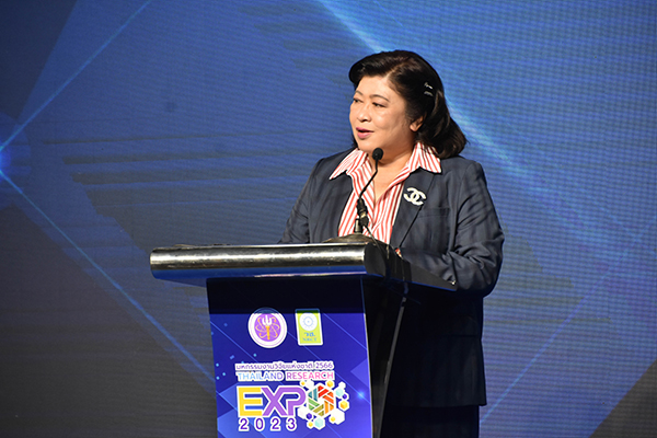 ดร.วิภารัตน์ ดีอ่อง ผู้อำนวยการสำนักงานการวิจัยแห่งชาติ กล่าวชื่นชมคณะอาจารย์ นิสิต นักศึกษา รวมไปถึงผู้บริหารหน่วยงานที่ให้การสนับสนุน และส่งเสริมกระบวนการสร้างสรรค์ หรือองค์ความรู้การวิจัย และนวัตกรรม เพื่อเป็นฐานความรู้ในการนำไปพัฒนาประเทศ โดยกิจกรรมประกวดผลงานนวัตกรรมสายอุดมศึกษาครั้งนี้ ถือเป็นกิจกรรมสำคัญหนึ่ง ภายในงาน “มหกรรมงานวิจัยแห่งชาติ 2566” หรือ “Thailand Research Expo 2023” ซึ่งจัดขึ้นเพื่อเป็นเวทีให้เยาวชนไทย ได้นำเสนอผลงานจากความคิดสร้างสรรค์ ตลอดจนเพื่อเป็นขวัญกำลังใจในการพัฒนาผลงานให้ก้าวไปสู่เส้นทางการเป็นนักวิจัยนักประดิษฐ์ ซึ่งจะเป็นกำลังสำคัญ ในการพัฒนาประเทศในอนาคตต่อไป ซึ่งการจัดกิจกรรมการประกวดผลงานนวัตกรรมสายอุดมศึกษาตลอดการจัดงานที่ผ่านมา มีผู้ให้ความสนใจผลงานของนิสิต นักศึกษา ทำให้เกิดการแลกเปลี่ยนประสบการณ์และความรู้ พร้อมทั้งเป็นการสร้างเครือข่ายด้านการวิจัยและนวัตกรรม ระหว่างนักศึกษาในระดับอุดมศึกษา เพื่อก้าวสู่การเป็นนักวิจัยในอนาคตที่ดี ด้วย