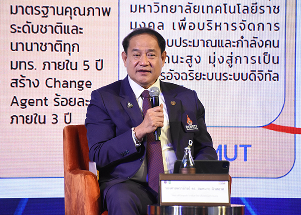 รศ.ดร.สมหมาย ผิวสอาด ประธานที่ประชุมอธิการบดีมหาวิทยาลัยเทคโนโลยีราชมงคล กล่าวว่า ในนามของ 9 มหาวิทยาลัยราชมงคลได้ร่วมกันจัดทำยุทธศาสตร์ในการมีบทบาทช่วยเหลือชุมชน การฟื้นฟูเศรษฐกิจโดยใช้องค์ความรู้ การสร้างทุนมนุษย์ที่มีความรู้ในการสร้างผู้ประกอบการ ทักษะเชี่ยวชาญด้านเทคโนโลยี นอกจากนี้ 9มหาวิทยาลัยราชมงคล รวม 36 วิทยาเขต ครอบคลุมพื้นที่ 23 จังหวัด ยังมีจุดแข็งในด้านทำเลที่ตั้งใกล้อุตสาหกรรมรายล้อมด้วยเอสเอ็มอีและการเกษตร ประกอบกับ นโยบายของมหาวิทยาลัยที่ต้องการให้ประเทศก้าวข้ามกับดักรายได้ปานกลาง มีการวางแผนปรับหลักสูตรเพิ่อบ่่มเพาะให้นักศึกษาทำงานร่วมกับผู้ประกอบการ โดยตั้งเป้าให้นักศึกษาทุกหลักสูตรที่สำเร็จการศึกษามีเงินเดือนมากกว่ามาตรฐาน 2.5 เท่า โดยมหาวิทยาลัยที่ได้รับการสนับสนุนทุนวิจัยจาก วช. เป็นงานวิจัยเชิงประยุกต์ ทำให้ 2 ปีที่ผ่านมาประสบความสำเร็จในการขับเคลื่อนงานวิจัย 23 หัวข้อ 145 โครงการ นอกจากนี้ สอวช. ยังได้มอบหมายให้ทางมหาวิทยาลัยทำยุทธศาสตร์พลิกโฉมระบบนิเวศผลิตกำลังคนที่มีทักษะสูงเป็นนวัตกรพร้อมรับใช้สังคมในการสร้างความเข้มแข็งอีกด้วย