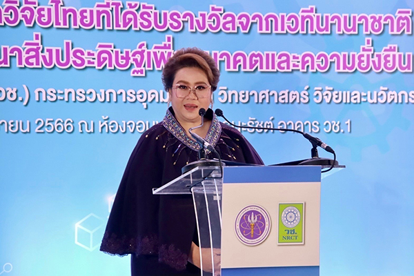 วันที่ 21 กันยายน 2566 นางสาวศุภมาส อิศรภักดี รัฐมนตรีว่าการกระทรวงการอุดมศึกษา วิทยาศาสตร์ วิจัยและนวัตกรรม (อว.) เป็นประธานในพิธีมอบประกาศนียบัตรแสดงความยินดีแก่นักประดิษฐ์และนักวิจัยไทยที่ได้รับรางวัลจากเวทีนานาชาติ เพื่อประกาศเกียรติคุณแก่นักประดิษฐ์และนักวิจัยไทยที่ได้รับรางวัลจากการนำผลงานวิจัยและนวัตกรรมไปประกวดเวทีนานาชาติ กว่า 48 ผลงาน จาก 2 เวที และพิธีเปิดศูนย์พัฒนาสิ่งประดิษฐ์เพื่ออนาคตและความยั่งยืน เพื่อสนับสนุนการเรียนรู้และพัฒนาต่อยอดผลงานวิจัย สิ่งประดิษฐ์ของนักวิจัย พร้อมปาฐกถาพิเศษ ในหัวข้อ “สิ่งประดิษฐ์เพื่ออนาคตและความยั่งยืน” โดยมี พ.ญ.เพชรดาว โต๊ะมีนา ที่ปรึกษา รมว.อว. และ ดร.วิภารัตน์ ดีอ่อง ผู้อำนวยการสำนักงานการวิจัยแห่งชาติ พร้อมด้วย คณะผู้บริหาร วช. และคณะนักวิจัย เข้าร่วม ณ ห้องประชุมจอมพลสฤษดิ์ ธนะรัชต์ อาคาร วช. 1 และศูนย์พัฒนาสิ่งประดิษฐ์เพื่ออนาคตและความยั่งยืน อาคาร วช. 7 สำนักงานการวิจัยแห่งชาติ (วช.) กรุงเทพมหานคร