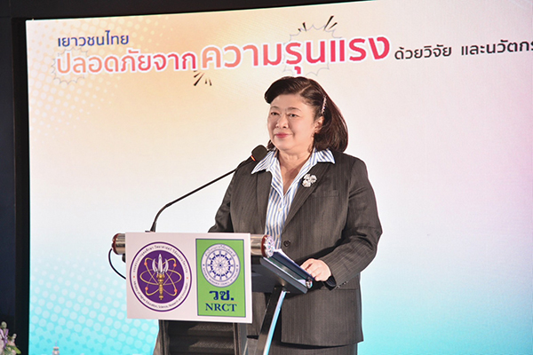 ดร.วิภารัตน์ ดีอ่อง ผู้อำนวยการสำนักงานการวิจัยแห่งชาติ กล่าวว่า วช. ภายใต้กระทรวง อว. เป็นหน่วยงานหลักในการบริหารจัดการทุนวิจัยของประเทศ ได้ตระหนักถึงปัญหาความรุนแรงทางสังคม ซึ่งถือเป็นปัญหาสำคัญระดับประเทศที่ต้องได้รับการแก้ไขอย่างจริงจัง จึงได้สนับสนุนแผนงานวิจัยสังคมไทยไร้ความรุนแรงเพื่อให้ได้แนวทางการแก้ไขปัญหาโดยเฉพาะในกลุ่มเด็กและเยาวชนไทยให้ปลอดภัยจากความรุนแรงในสังคมที่ครอบคลุมในมิติต่าง ๆ นับว่าเป็นโจทย์ที่ท้าทายหนึ่งที่สำคัญสำหรับการวิจัยที่จะช่วยยกระดับคุณภาพชีวิตและความเป็นอยู่ทางสังคมให้กับคนไทยได้อย่างมั่นคง และสามารถนำไปสู่การลดปัญหาความรุนแรงในสังคมไทยได้อย่างยั่งยืน ในวันนี้ วช. ได้ยกประเด็น 4 ประเด็นหลัก เพื่อเป็นแนวทางในการป้องกันแก้ไขปัญหาเด็กและเยาวชนไทยปลอดภัยจากความรุนแรงในสังคมไทย ดังนี้ 1. การแก้ปัญหาสถานการณ์เยาวชนกับความรุนแรงในสังคมไทย ซึ่งเป็นผลงานภายใต้ โครงการวิจัย สถานการณ์เยาวชนกับความรุนแรงในสังคมไทย: กรณีศึกษางานวิจัย “ครอบครัวพลังบวก” โดยมี รองศาสตราจารย์ นายแพทย์สุริยเดว ทรีปาตี ศูนย์คุณธรรม (องค์การมหาชน) เป็นหัวหน้าโครงการ โดยนำหลักการพัฒนาระบบพี่เลี้ยงที่ปรึกษาชุมชน มุ่งสร้างครอบครัวพลังบวก รวมไปถึงการให้ความรัก ความอบอุ่น และความปลอดภัยที่มีอยู่ในสมาชิกของทุกคนเพื่อการอยู่ร่วมกันในสังคม เพราะครอบครัวคือหน่วยในการสร้างพลเมืองที่ดีของสังคมไทย 2. การแก้ปัญหาติดเกมในเด็กและเยาวชนไทยในช่วงอายุ 6-25 ปี ซึ่งเป็นผลงานภายใต้ โครงการวิจัย “การศึกษาปัญหาติดเกมในเด็กและเยาวชนไทยอายุ 6-25 ปี” โดยมี ผู้ช่วยศาสตราจารย์ นายแพทย์วัลลภ อัจสริยะสิงห์ จาก มหาวิทยาลัยมหิดล เป็นหัวหน้าโครงการ โดยมอบหมายให้ นางสาวณัฐพร กังสวิวัฒน์ เป็นผู้แถลงผลดำเนินการวิจัย ปัจจุบันโลกออนไลน์รวมถึงเกมได้รับความนิยมเป็นอย่างมาก ความท้าทายในการแก้ปัญหาเด็กติดเกม คือ การเสริมสร้างการเห็นคุณค่าในตัวเองให้เด็กไปพร้อม ๆ กับการเอาชนะอิทธิพลทางสังคมที่อาจส่งผลให้เด็กขาดการเห็นคุณค่าในตนเอง ผลงานวิจัยนี้เด็กและวัยรุ่นได้รับความรู้เรื่องการเล่นเกมอย่างเหมาะสม ส่วนผู้ปกครองได้รับความรู้เรื่องการดูแลเรื่องการเล่นเกมของลูกหลาน ได้ข้อเสนอแนะถึงแนวทางการแก้ปัญหาการติดเกมในเด็กและเยาวชนไทย 3. การป้องกันความรุนแรงในสังคมไทย: โปรแกรมเด็กรุ่นใหม่ใจเย็น ๆ การฝึกทักษะชีวิตในการจัดการความโกรธในวัยเด็ก ซึ่งเป็นผลงานวิจัยภายใต้ โครงการวิจัย “การศึกษาป