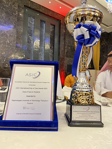 อธิการบดี มทร.ธัญบุรี ยังกล่าวอีกว่าในงาน ASIC Annual Conference & Award 2023 ยังได้มอบ 2 รางวัลใหญ่ระดับนานาชาติแก่ มทร.ธัญบุรี โดยมี รศ.ดร.บุญยัง ปลั่งกลาง ผู้ช่วยอธิการบดี เป็นผู้แทนรับรางวัล ซึ่งรางวัลแรกคือ รางวัล Entrepreneurship in Education ที่มหาวิทยาลัยได้สะท้อนถึงความเป็นมหาวิทยาลัยนวัตกรรมในการสร้างความเป็นผู้ประกอบการให้แก่นักศึกษา ส่วนอีกหนึ่งรางวัลคือ รางวัล Duty of Care to Student ที่ มทร.ธัญบุรี มีแนวนโยบายและการปฏิบัติเพื่อดูแลนักศึกษาอย่างเป็นเลิศในหลายด้านด้วยกัน ซึ่งทั้งสองรางวัลนี้เป็นผลมาจากการดำเนินงานที่เข้มข้น ต่อเนื่อง และความร่วมมือร่วมใจของทุกฝ่ายที่เกี่ยวข้อง