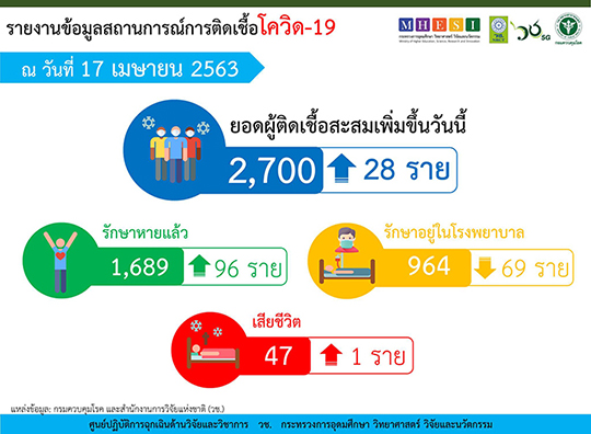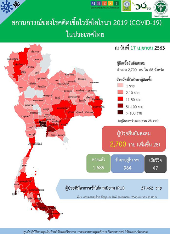 ผู้ติดเชื้อสะสม 2,700 ราย ใน 68 จังหวัด (เพิ่มขึ้นในวันนี้ 28 ราย)