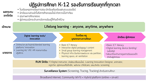 สำหรับมาตรการฟื้นฟู เป้าหมายสำคัญ คือ ปรับเปลี่ยนรูปแบบของการศึกษาและการเรียนรู้ของสถาบันการศึกษาให้ก้าวเข้าสู่ความเป็น “new normal schools” สามารถจัดการศึกษาและการเรียนรู้ได้อย่างต่อเนื่อง มีคุณภาพ คนทุกกลุ่มสามารถเข้าถึงได้ ซึ่งจะทำให้นักเรียน นักศึกษา หรือผู้เรียนทุกช่วงวัยสามารถเรียนรู้ได้ทุกที่ ทุกเวลา แม้ในภาวะวิกฤต