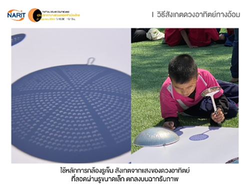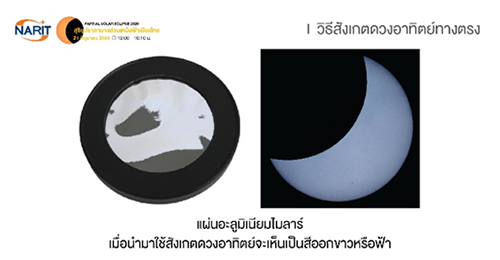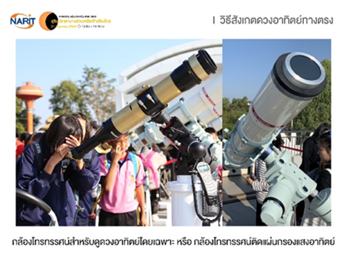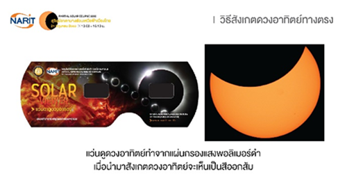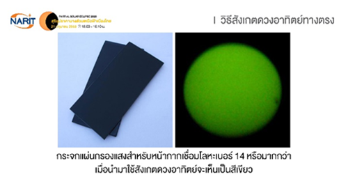 โดยคุณศุภฤกษ์ คฤหานนท์ หัวหน้างานบริการวิชาการทางดาราศาสตร์ สดร.กล่าวถึงข้อควรระวังเกี่ยวกับการสังเกตปรากฏการณ์สุริยุปราคาบางส่วนในประเทศไทย ว่า การสังเกตปรากฏการณ์สุริยุปราคาเป็นการสังเกตดวงอาทิตย์โดยตรงห้ามสังเกตด้วยตาเปล่าเด็ดขาด การจ้องมองดวงอาทิตย์โดยไม่มีอุปกรณ์ป้องกัน อาจนำอันตรายมาสู่ดวงตาถึงขั้นทำให้ตาบอดได้ วิธีการสังเกตดวงอาทิตย์ โดยทั่วไปแบ่งออกเป็น 2 ประเภท ได้แก่ การสังเกตดวงอาทิตย์ทางตรงผ่านอุปกรณ์กรองแสง และการสังเกตดวงอาทิตย์ทางอ้อม