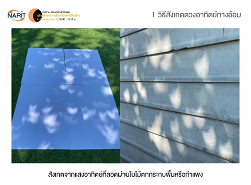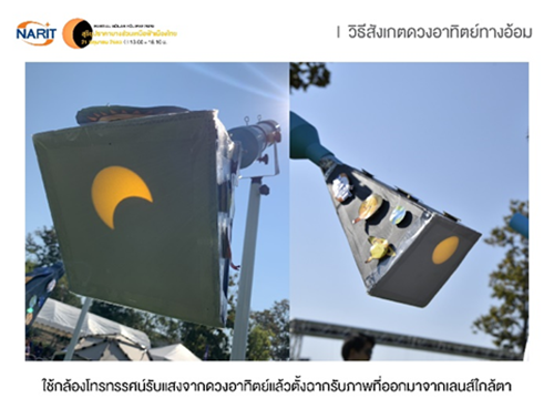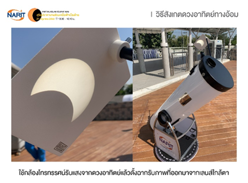 วิธีที่ 2 การสังเกตดวงอาทิตย์ทางอ้อม เป็นการดูแสงของดวงอาทิตย์ผ่านฉากรับภาพหรือใช้หลักการของกล้องรูเข็ม การสังเกตดวงอาทิตย์ทางอ้อมเป็นวิธีที่มีความปลอดภัยไม่เกิดอันตรายต่อดวงตาและช่วยให้สามารถดูปรากฏการณ์ดังกล่าวได้ทีละหลายคน ได้แก่ ใช้กล้องโทรทรรศน์รับแสงจากดวงอาทิตย์แล้ว ตั้งฉากรับภาพที่ออกมาจากเลนส์ใกล้ตา หรือประดิษฐ์กล้องรูเข็มอย่างง่าย ใช้หลักการรวมแสงให้ไปฉายบนฉากรับภาพได้อีกด้วย