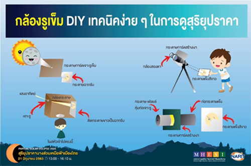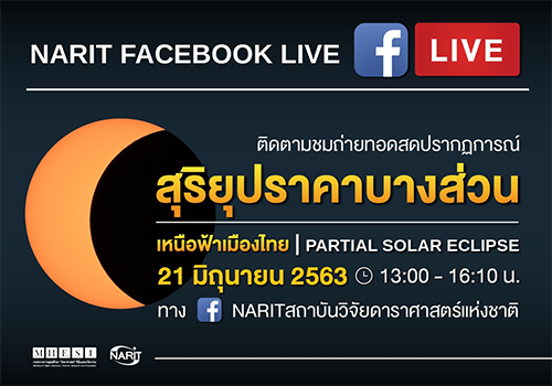 สำหรับประชาชนที่สนใจ ในปีนี้เนื่องด้วยสถานการณ์การระบาดของโรคโควิด 19 สดร. จึงปรับเปลี่ยนรูปแบบกิจกรรมโดยการถ่ายทอดสดปรากฏการณ์สุริยุปราคาบางส่วนจากหอดูดาวภูมิภาคทั้ง 4 แห่ง ของ สดร. ได้แก่ อุทยานดาราศาสตร์สิรินธร อ. แม่ริม จ. เชียงใหม่ และหอดูดาวเฉลิมพระเกียรติฯ นครราชสีมา ฉะเชิงเทรา และสงขลา ในวันที่ 21 มิถุนายน 2563 ตั้งแต่เวลา 13:00 - 16:10 น. สามารถติดตามได้ทางเพจFacebook NARIT สถาบันวิจัยดาราศาสตร์แห่งชาติ www.facebook.com/NARITpage