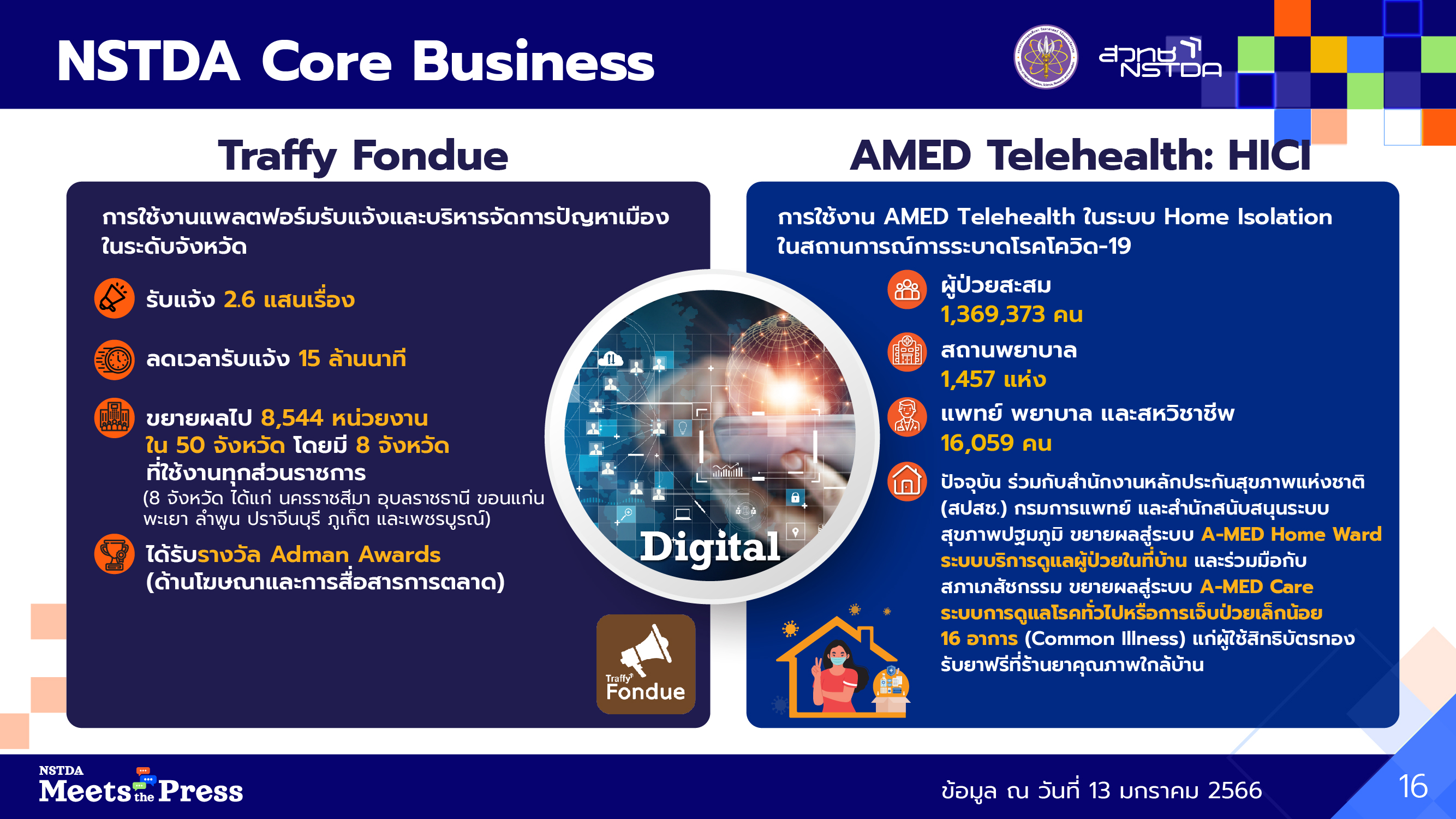 “Traffy Fondue คือแพลตฟอร์มรับแจ้งและบริหารจัดการปัญหาเมืองในระดับจังหวัด ซึ่งปัจจุบันรับแจ้งปัญหาแล้วมากกว่า 260,000 เรื่อง ช่วยลดเวลารับแจ้งปัญหาถึง 15 ล้านนาที มีการขยายผลการใช้งานไป 8,544 หน่วยงาน ใน 50 จังหวัด โดยมี 8 จังหวัด ที่ใช้งานทุกส่วนราชการ (นครราชสีมา อุบลราชธานี ขอนแก่น พะเยา ลำพูน ปราจีนบุรี ภูเก็ต และเพชรบูรณ์) ขณะเดียวกันยังมีการพัฒนาเทคโนโลยีที่สนับสนุนการบริการสาธารณสุข ด้วยแพลตฟอร์ม A-MED Telehealth แพลตฟอร์มหลังบ้าน เพื่อช่วยให้บุคลากรทางแพทย์สามารถทำงานบนข้อมูลเดียวกัน ในการตรวจ รักษา และติดตามผู้ป่วย ในระบบ Home Isolation ในสถานการณ์การระบาดโรคโควิด-19 รวมทั้งยังสามารถเชื่อมต่อการเบิกจ่ายผ่านระบบสาธารณสุขหลักของประเทศ ปัจจุบันมีผู้ป่วยใช้งานสะสมมากกว่า 1,360,000 คน สถานพยาบาล 1,400 แห่ง รวมถึงแพทย์ พยาบาลและสหวิชาชีพมากกว่า 16,000 คน นอกจากนี้ยังมีความร่วมมือกับ สํานักงานหลักประกันสุขภาพแห่งชาติ (สปสช.) กรมการแพทย์ และสํานักสนับสนุนระบบสุขภาพปฐมภูมิ ขยายผลสู่ระบบ A-MED Home Ward ระบบบริการดูแลผู้ป่วยใน ที่บ้าน และร่วมมือกับสภาเภสัชกรรม ขยายผลสู่ระบบ A-MED Care ระบบการดูแลโรคทั่วไปหรือการเจ็บป่วยเล็กน้อย 16 อาการ (Common Illness) แก่ผู้ใช้สิทธิบัตรทอง สามารถรับยาฟรีที่ร้านยาคุณภาพใกล้บ้าน”