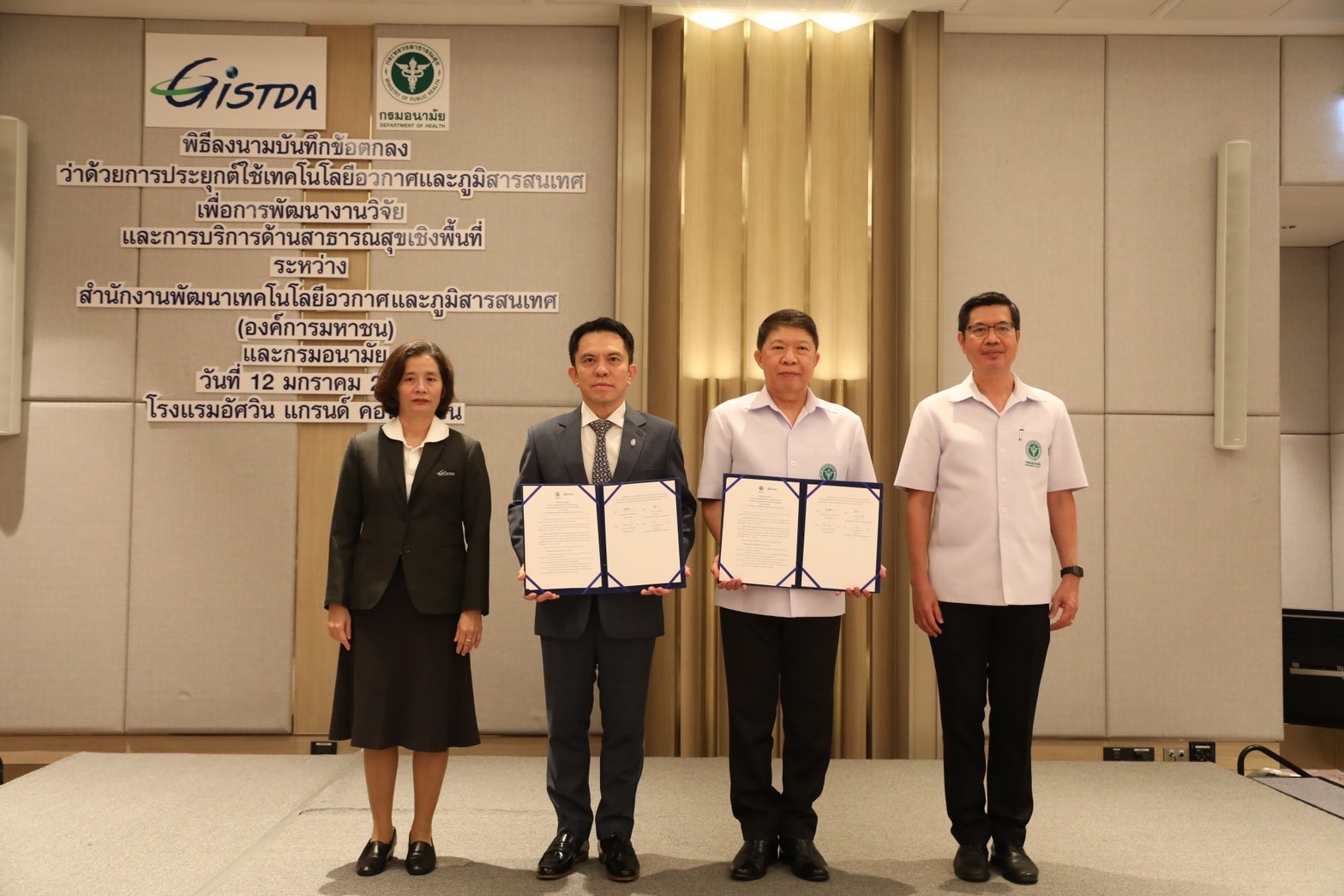 (12 มกราคม 2566) สำนักงานพัฒนาเทคโนโลยีอวกาศและภูมิสารสนเทศ (องค์การมหาชน) หรือ GISTDA ภายใต้กระทรวงการอุดมศึกษา วิทยาศาสตร์ วิจัยและนวัตกรรม (อว.) ร่วมกับ กรมอนามัย กระทรวงสาธารณสุข ลงนามบันทึกข้อตกลงความร่วมมือว่าด้วยการประยุกต์ใช้เทคโนโลยีอวกาศและภูมิสารสนเทศ เพื่อการพัฒนางานวิจัยและการบริการด้านสาธารณสุขเชิงพื้นที่ ณ ห้องพระอินทร์ 2 ชั้น 2 โรงแรมอัศวิน แกรนด์ คอนเวนชั่น กรุงเทพฯ